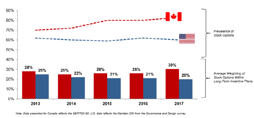 Based on public filings from 2018 and earlier, stock option usage among large Canadian companies has plateaued in Canada (with ~80% of the TSX 60 granting options to executives in the 2017 compensation year). In the U.S., there has been a decline in stock option usage, at around ~60% prevalence for the Meridian 200 (a sample of large U.S. public companies).