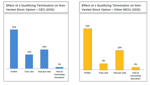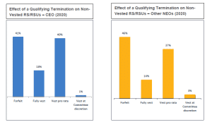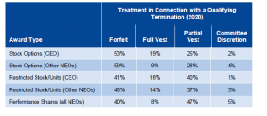 • Prevalence of vesting and settlement of long-term incentive awards in connection with a qualifying termination. A majority of the Study Group companies forfeit stock options upon a qualifying termination. In contrast, a majority of the Study Group companies fully or partially vest restricted stock/restricted stock units (“RSUs”) in connection with a qualifying termination. For performance shares, practice is roughly split among Study Group companies between forfeit and full or partial vest in connection with a qualifying termination.