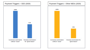 Executive severance benefits are universally triggered upon an executive’s termination of employment without “cause.” Less frequently, executive severance benefits are triggered upon an NEO’s voluntary termination of employment for “good reason.” The lower prevalence is primarily due to company preference to retain flexibility to modify compensation and benefit arrangements, reporting relationships, duties and/or office location over time, without triggering executive severance benefits.