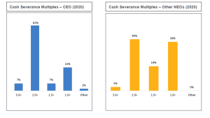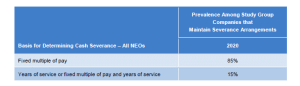 • Cash Severance Based on a Fixed Multiple of Pay – The dominant severance multiple for CEOs and other NEOs was 2.0x (62% and 40% of companies, respectively).