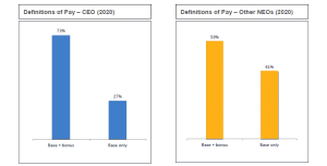 For CEOs, 73% of companies define pay as the sum of base salary and annual bonus and, for other NEOs, 59% of companies define pay as the sum of base salary and annual bonus.