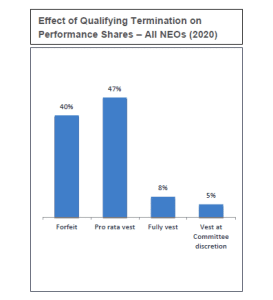 Unlike options and restricted stock/RSUs, the most dominant practice is to pro rata vest performance shares upon a qualifying termination, with forfeiture the next most prevalent practice.