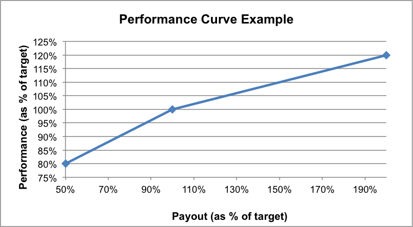 The graphic below provides an example. Curves may vary among and even within industries and will depend on how easy it is to set performance goals. For example, in cases when goal setting is particularly difficult due to economic uncertainties or other issues, a Committee may choose to create a relatively flatter slope, with less variability in payout for any given change in performance.