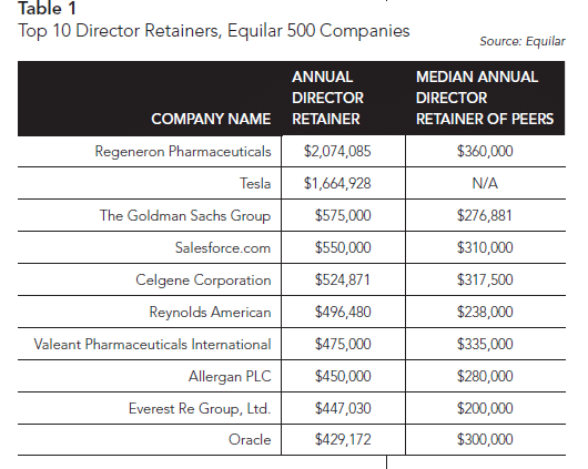 When compared to the median annual director retainer of their respective peer groups, Equilar found that seven of the 10 companies with the highest retainers paid their board over 50% more than their peers. (Tesla does not disclose a peer group.) In fact, four companies paid over double the median of their peer group. Six of the nine companies with peer groups had the highest retainer amongst their peers—however, Celgene, Oracle and Valeant Pharmaceuticals each have a peer in this top 10 list, putting them second among their peers.