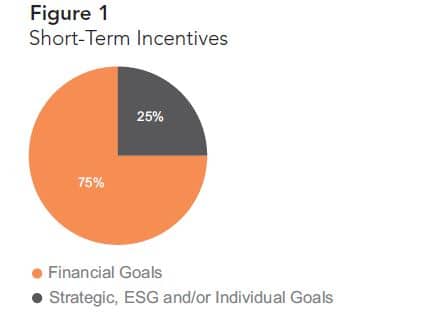 In “normal” times, the most common design approach for an executive short-term incentive plan includes using one or two company-wide financial goals for approximately 75% of the annual bonus opportunity. The remaining 25% is allocated to the achievement of strategic, individual or environmental, social and governance (ESG) type goals. This approach provides focus for executives on important company-wide financial goals, which shareholders, analysts and governance firms prefer. This also allows for promotion of key strategic accomplishments, ESG goals and differentiation for individual performance.