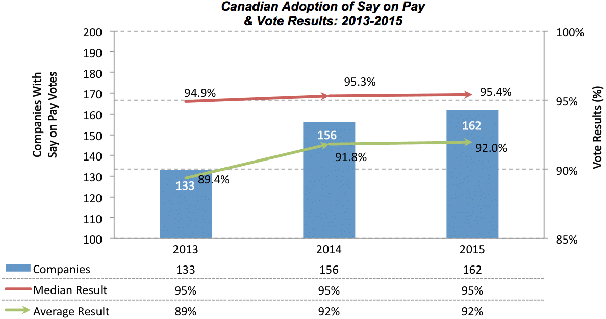 Although Say on Pay remains voluntary in Canada, the number of companies with an advisory resolution on executive compensation continues to rise, with 162 companies holding Say on Pay votes in 2015 – up from 156 in 2014 and 133 in the year prior (a 22% increase since 2013).