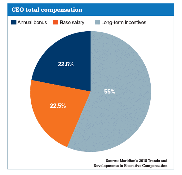 The main components of CEO compensation for large US-based companies are base salary, an annual bonus opportunity and a yearly grant of equity-based long-term incentives, which are typically earned over a three-year period. The cash components (base pay and annual bonus) have increased at a rate of approximately 2–3% annually for the past seven or eight years.