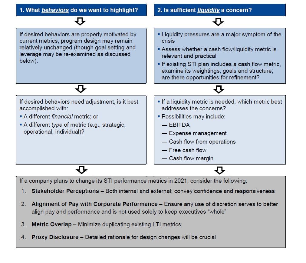 In any economic environment, the performance metrics used in executive STI plans should reflect both key drivers of long-term value and optimal alignment with company strategy. However, due to the extraordinary external situation in light of COVID-19 and the related economic impact, it is prudent to consider whether the current metrics remain ideal. Broadly, in this assessment there are two issues:
