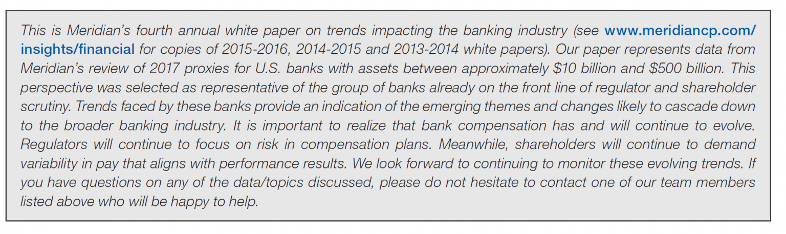 Meridian will continue to monitor practices of the larger banks and report on their impact as they likely cascade throughout the industry. Please let us know if you are interested in any custom cuts of our 2016 proxy database.
