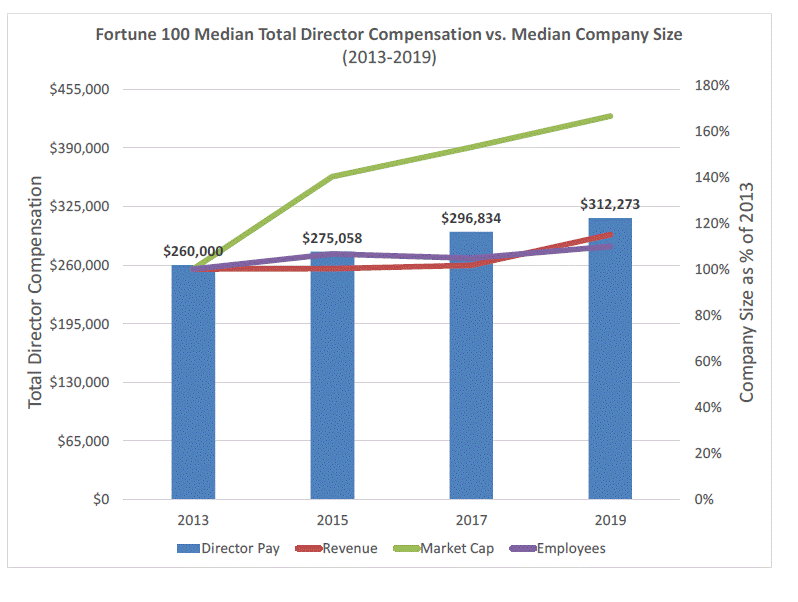 Pay levels have been relatively stable over the past six years. Our internal research specific to the Fortune 100 reveals that median total director compensation for large companies has increased modestly at a rate of 3% per year. This is slightly above the compounded annual growth rate of the companies with respect to revenue and employees, but well behind the recent growth in market capitalization.1