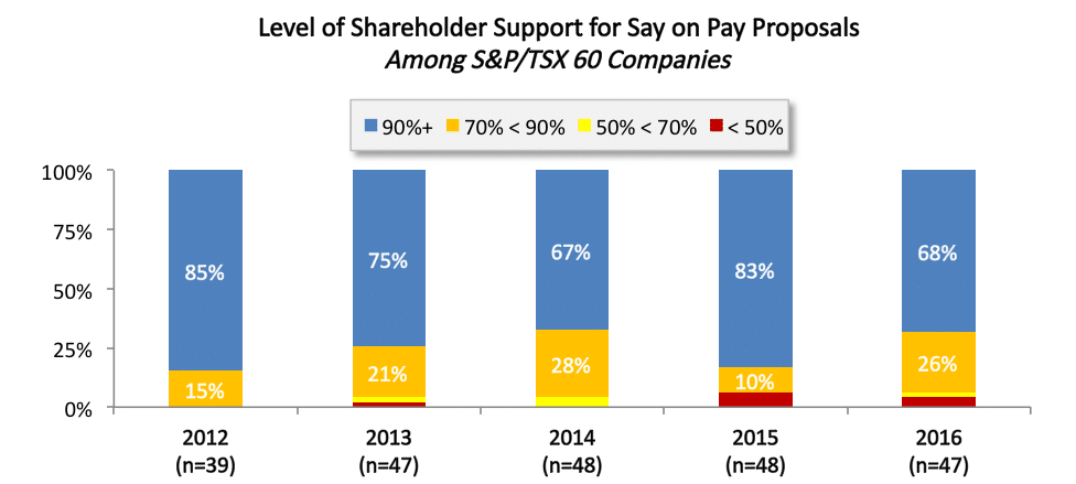 Last year there were three very public Say on Pay failures among S&P/TSX 60 companies – at Barrick Gold, CIBC, and Yamana Gold. All three of those companies held Say on Pay votes again in 2016, and all three votes passed this time, with 87% – 96% support.