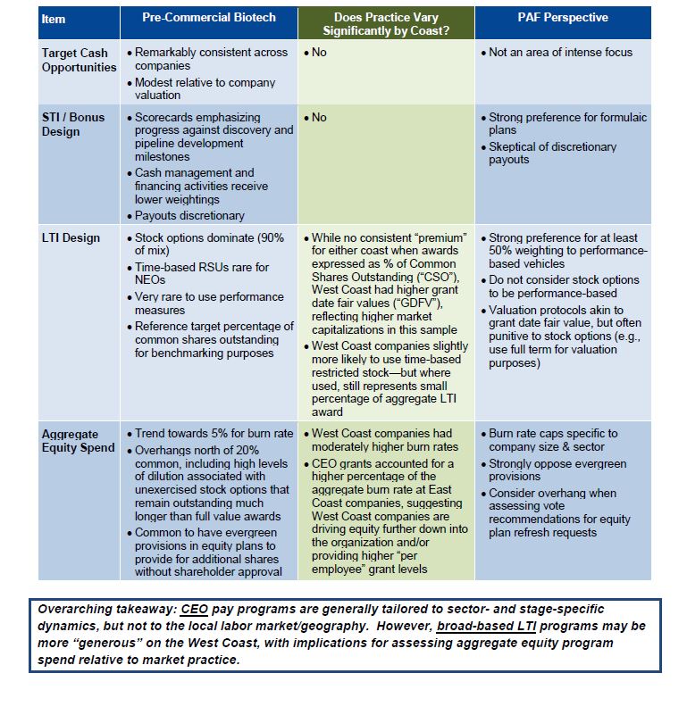 Our research determined that East Coast and West Coast pre-commercial biotech companies compare to broader sector benchmarks and PAF preferred practices as follows: