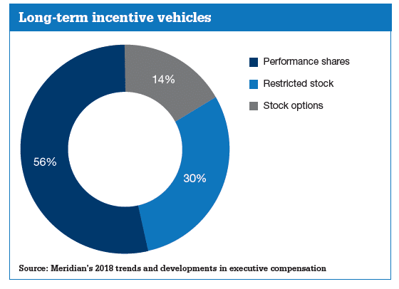 For well over 50 years, there has been the same three general design categories of long-term incentives for US-based CEOs. These have been full-value share grants, which vest over time and focus on retention; stock appreciation vehicles, such as stock options and stock appreciation rights, which focus on driving share price over the long term; and performance-based vehicles, like performance shares or units, which involve the achievement of specific absolute financial measures, or stock performance relative to that of a set of peers, over an intermediate term of three or four years. Most organizations use simultaneous combinations to focus on multiple strategic objectives.
