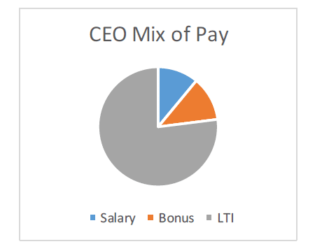 Lots of analysis has focused on which annual incentive metrics correlate best to shareholder returns, but over 75% of the CEO’s compensation program is perfectly correlated to shareholder returns. Long-term incentives in this industry are typically denominated in company shares and often also tied to relative shareholder return performance.