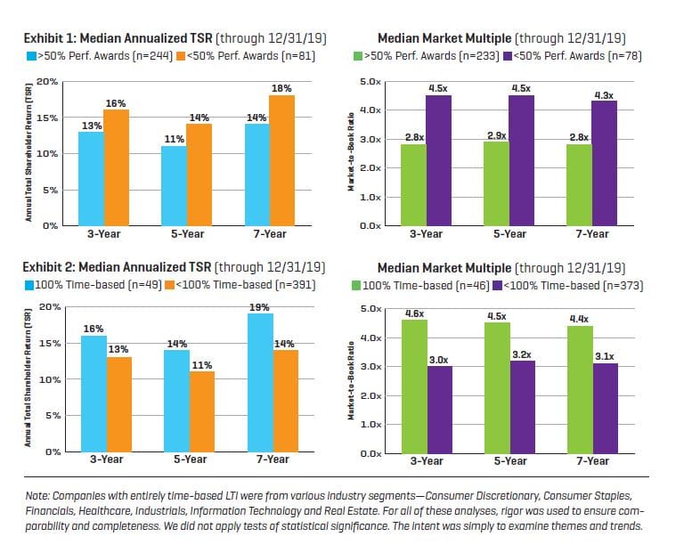 We analyzed both total shareholder return and market-to-book ratios for the last 3-, 5-, and 7-years for companies that maintained this LTI mix for at least the last 5 years. The median performing company granting ≥ 50 percent of LTI in performance awards underperformed the median of those granting less than 50% in performance awards. (See Exhibit I)
