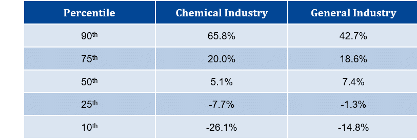 These factors drive volatility in business results over time. The chart below illustrates a performance distribution based on 10 years of 1-year EBITDA growth rates for 50 of the largest chemical companies in the United States. The top and bottom deciles highlight the industry’s volatility.