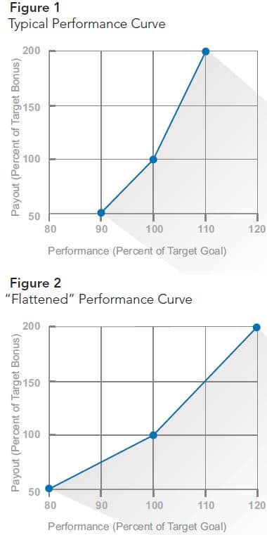 When addressing the difficulty of goal setting in an uncertain environment, the first strategy to consider is adjusting the slope of the “performance curve.” The performance curve is simply the relationship between the performance goals and the corresponding incentive payout.
