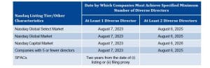- Include at least two diverse directors by a specified date, based on the company’s listing tier, as described below, or publicly disclose and explain its noncompliance with the board diversity requirement.