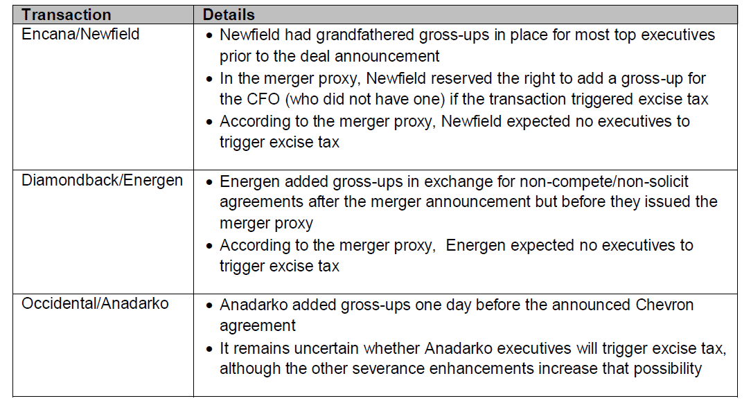 There have been a few recent industry transactions, including Anadarko’s, where the target company re-inserted gross-up protections, either for all executives or for executives who didn’t already have them.
